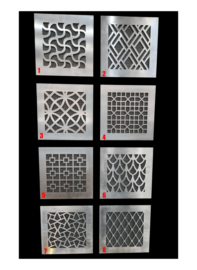 Также предлагаем Вам стандартные решения декоративных решеток из нержавеющей стали, стандартных размеров и разной перфорации (внешнего вида решетки)